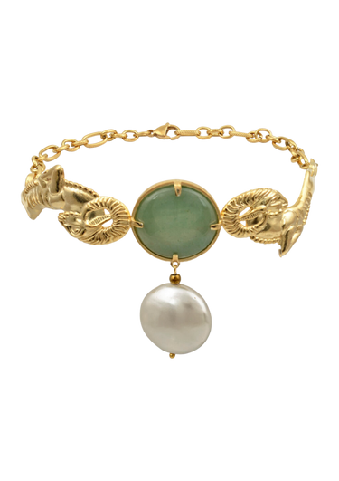 Ogrlica izradjena od solidne bronze, u 24k pozlati, sa polu-dragim kamenjem Aventurina, Zlatnog Hematita, Organskim Perlama, i lancima od nerdjajućeg čelika.