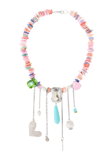 Ogrlica od školjki, mesing obložen srebrom, raznobojni preciosa kristali.