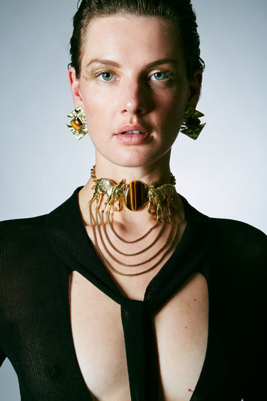 Poručite ogrlicu izradjenu od bronze u 24k pozlati, sa lancima od nerdjajućeg čelika. Polu dragi kamen tirgovo oko.