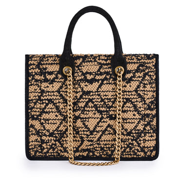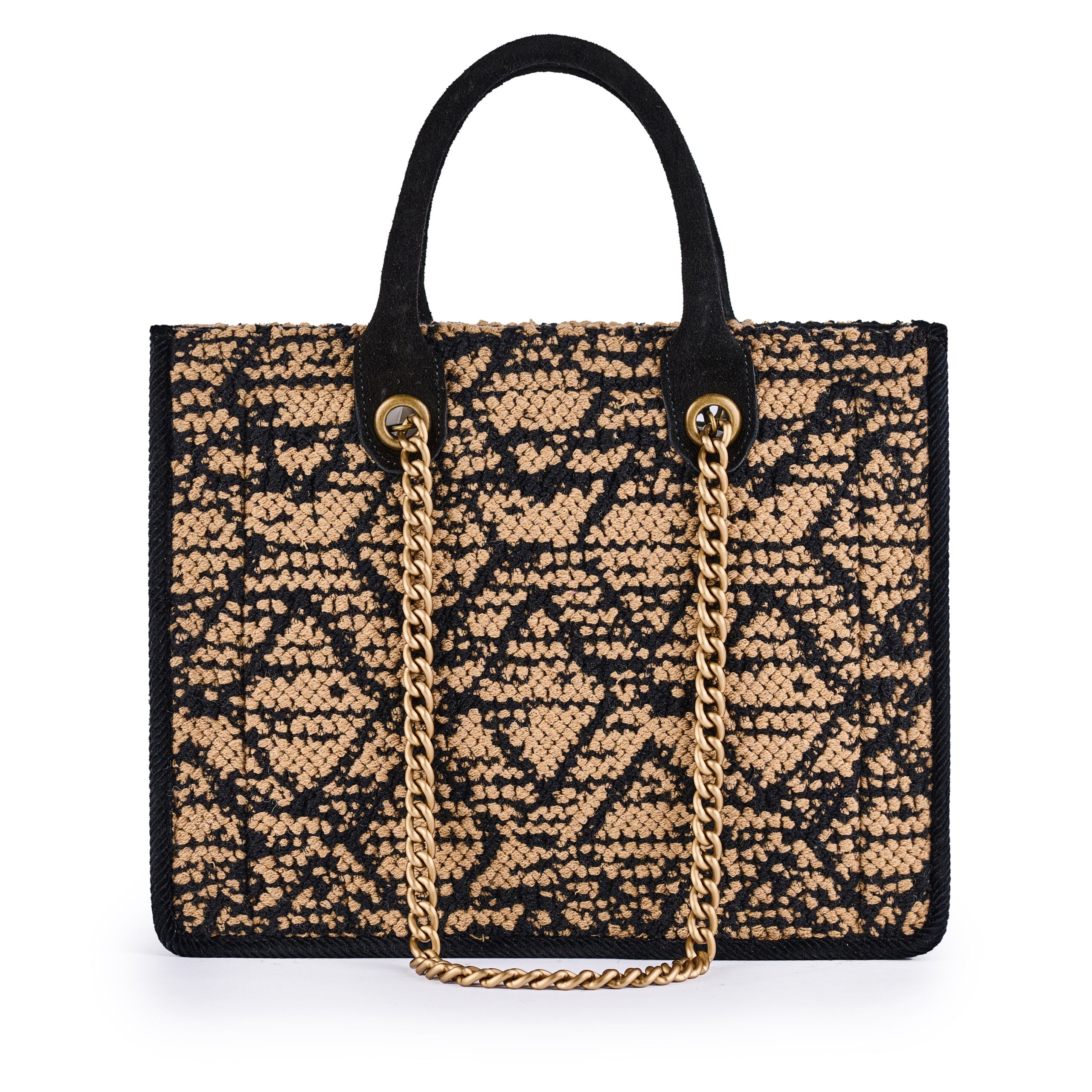 Pamučna torba od žakard materijala s ručkom od brušene kože, lancem, magnetom i baršunastim kaišom za rame s detaljima od brušene kože.