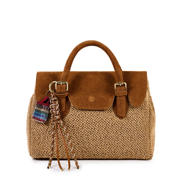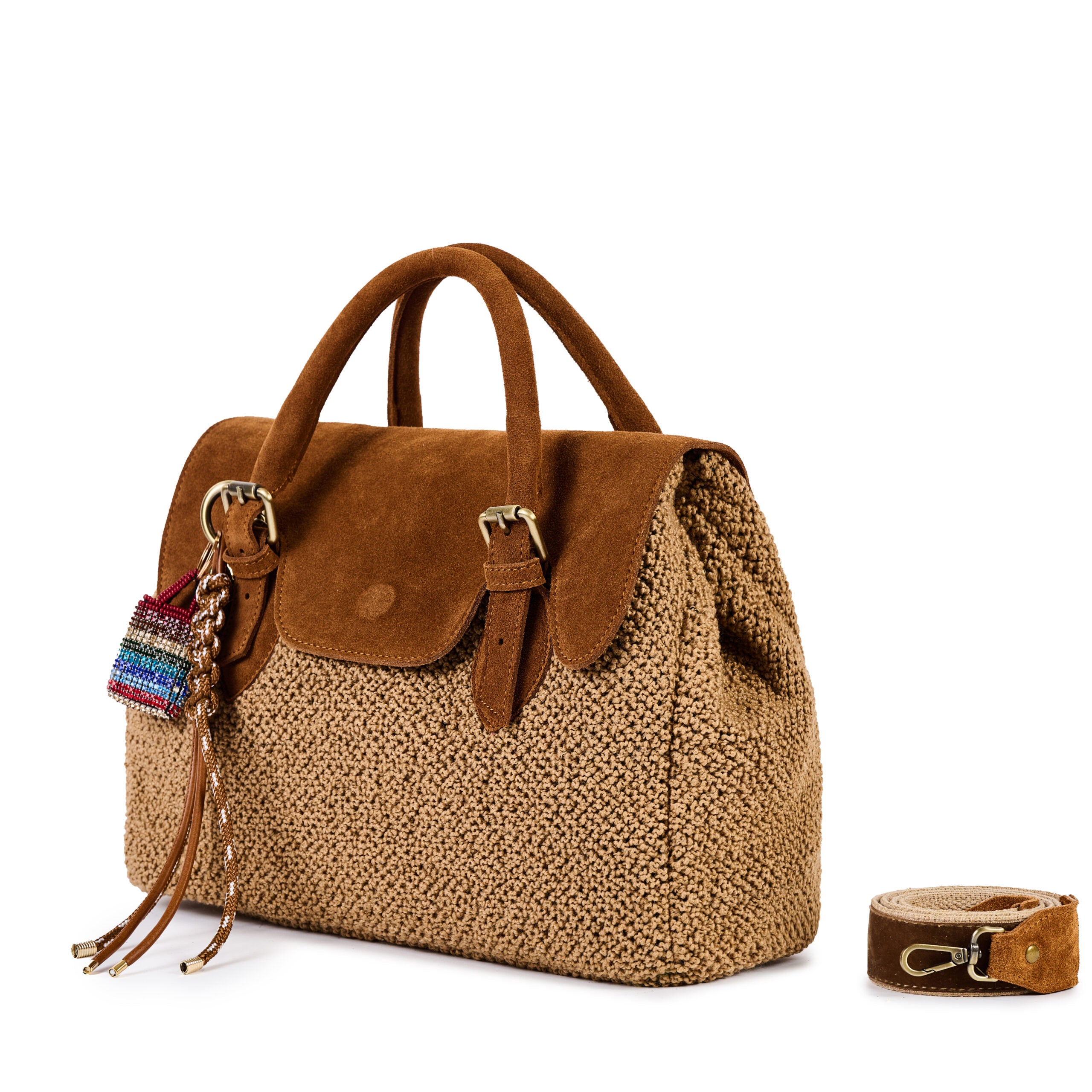 Pamučna torba s bukle efektom, preklopom od antilopa i priveskom, ručkama od antilopa, unutrašnjim džepom i baršunastim kaišom za rame s detaljima od antilopa.