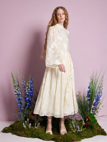 Dandelion midi haljina bež boje odiše romantikom prošlih vremena, izrađena od nežne organze sa cvetnim motivima. Visoki izrez, široki zvonasti rukavi sa talasastim ivicama i čipkani detalji donose dašak vintage šarma, dok silueta inspiriše na Regencycore estetiku — spoj korseta, brokata i „dramatičnih rukava“ u savremenoj interpretaciji.