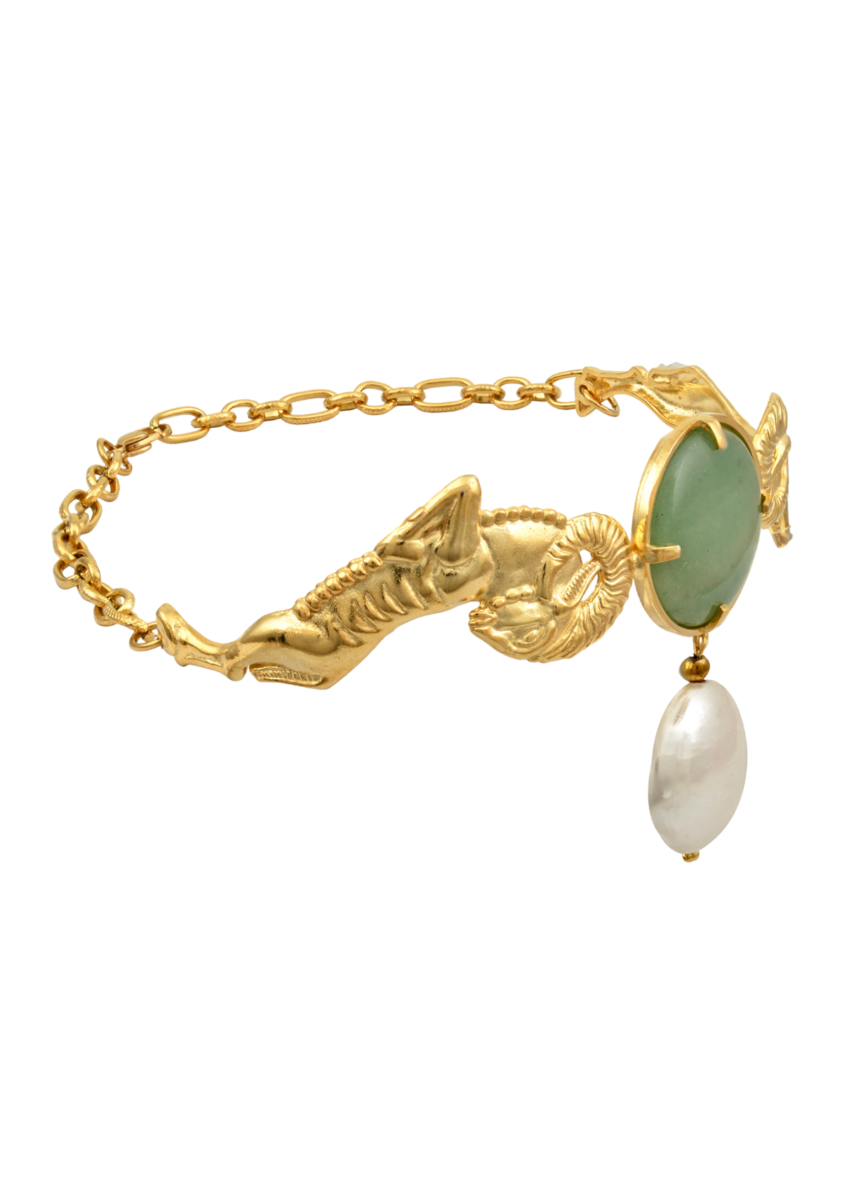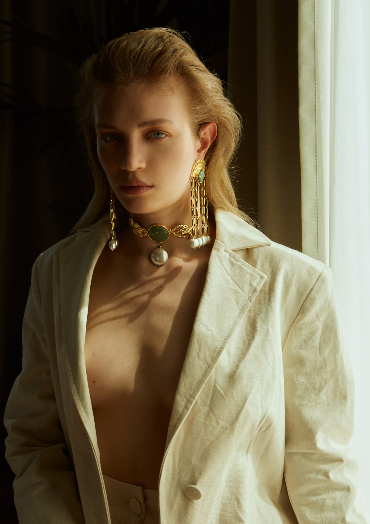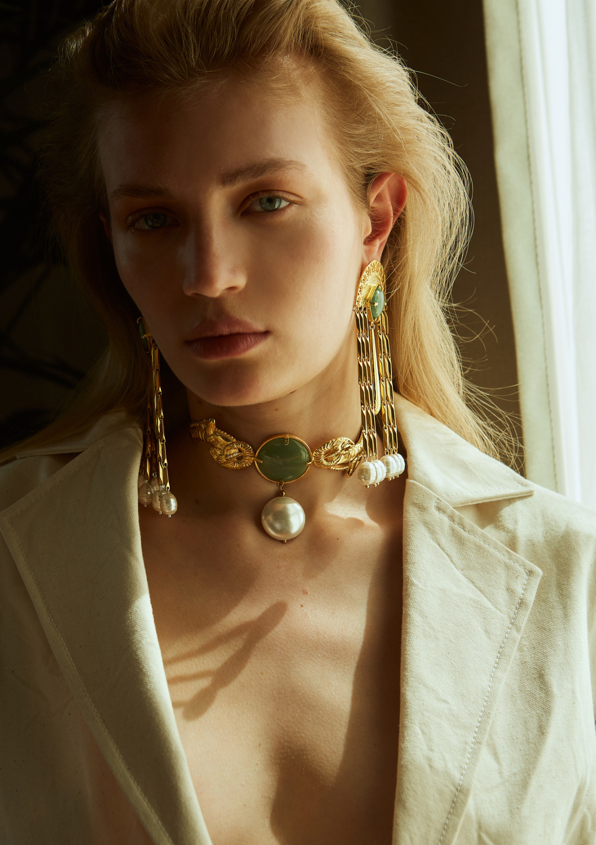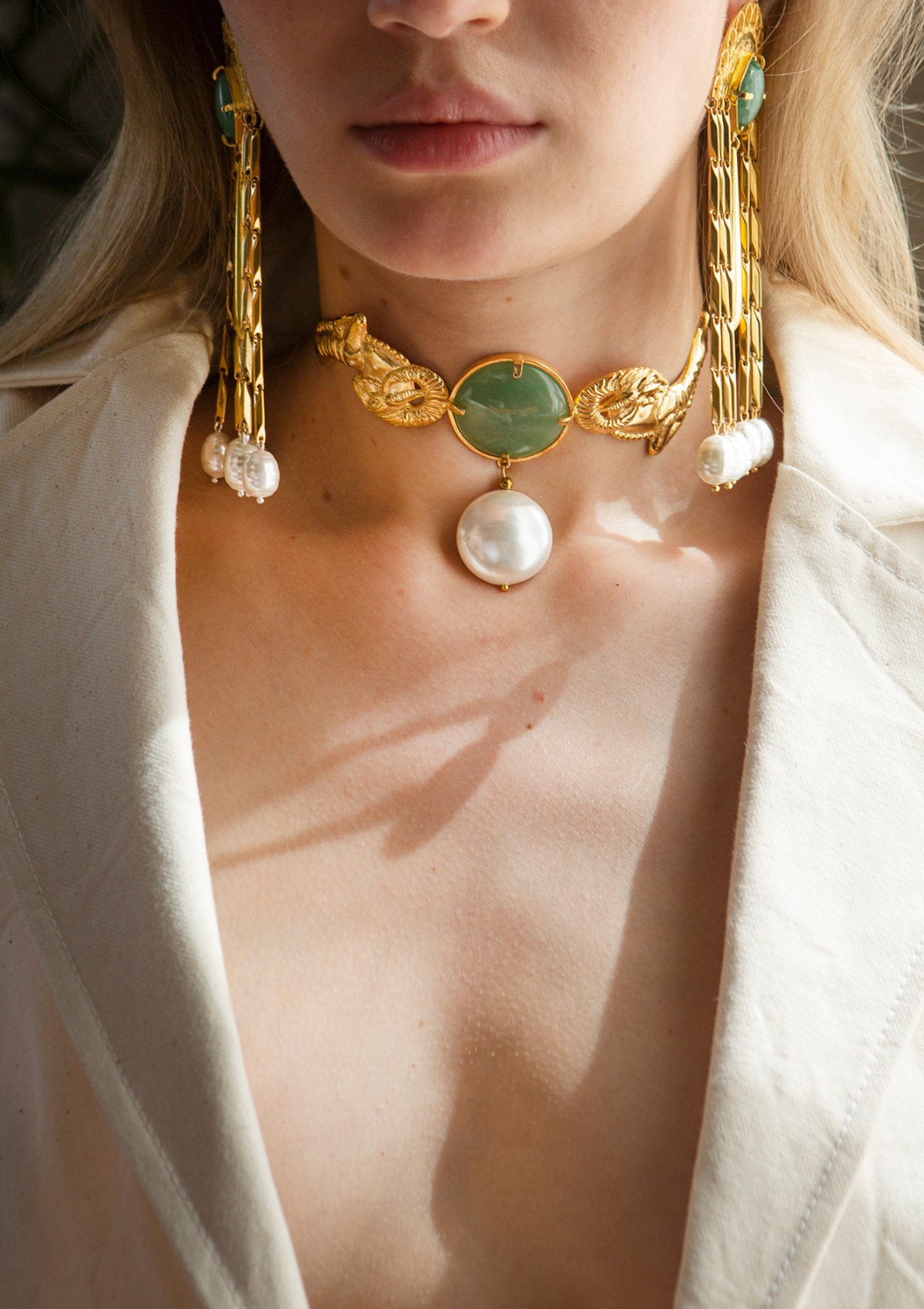 Ogrlica izradjena od solidne bronze, u 24k pozlati, sa polu-dragim kamenjem Aventurina, Zlatnog Hematita, Organskim Perlama, i lancima od nerdjajućeg čelika.