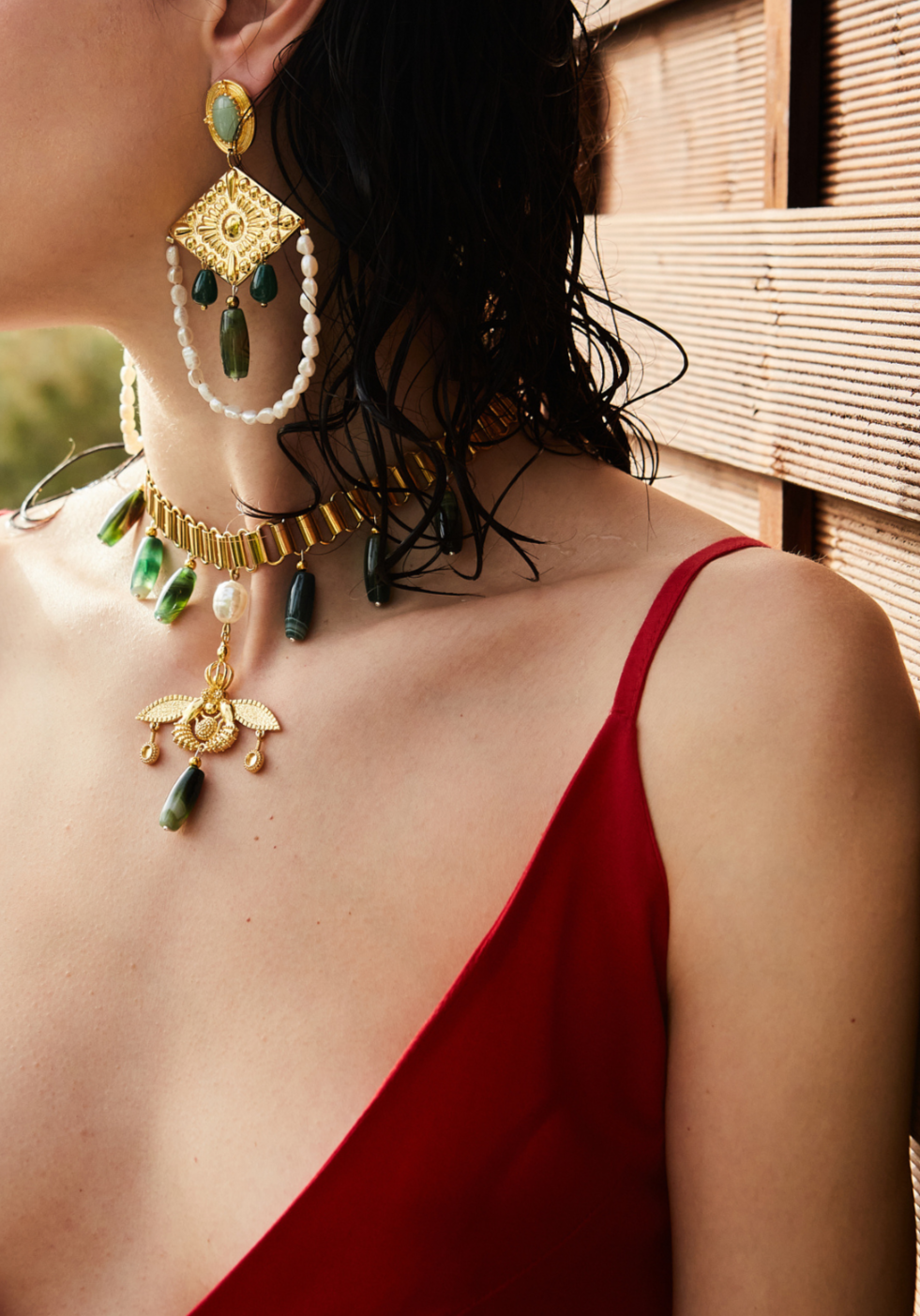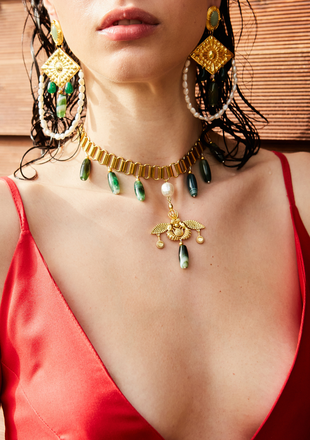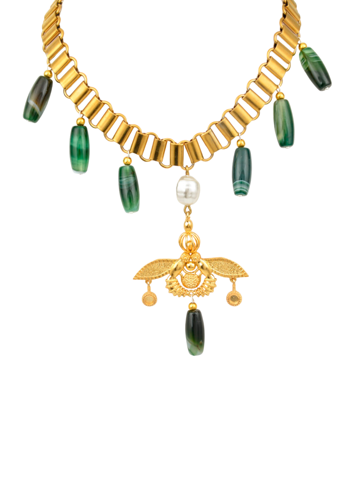 Ogrlica od solidne bronze, sa polu dragim kamenjem koje visi od zelenog ahata, male sfere su od zlatnog Hematita, organskih perli i lanac od nerdjajućeg čelika.