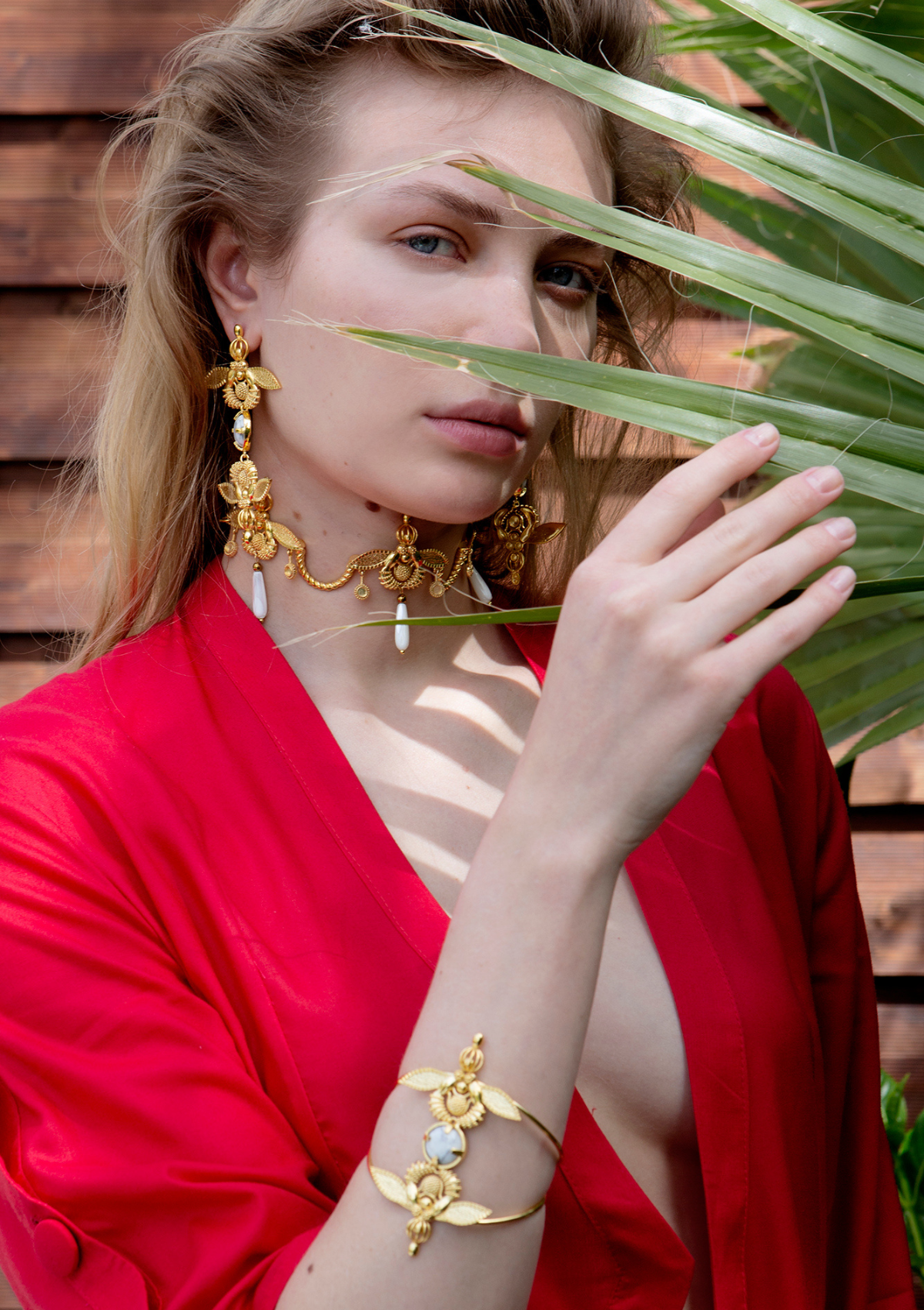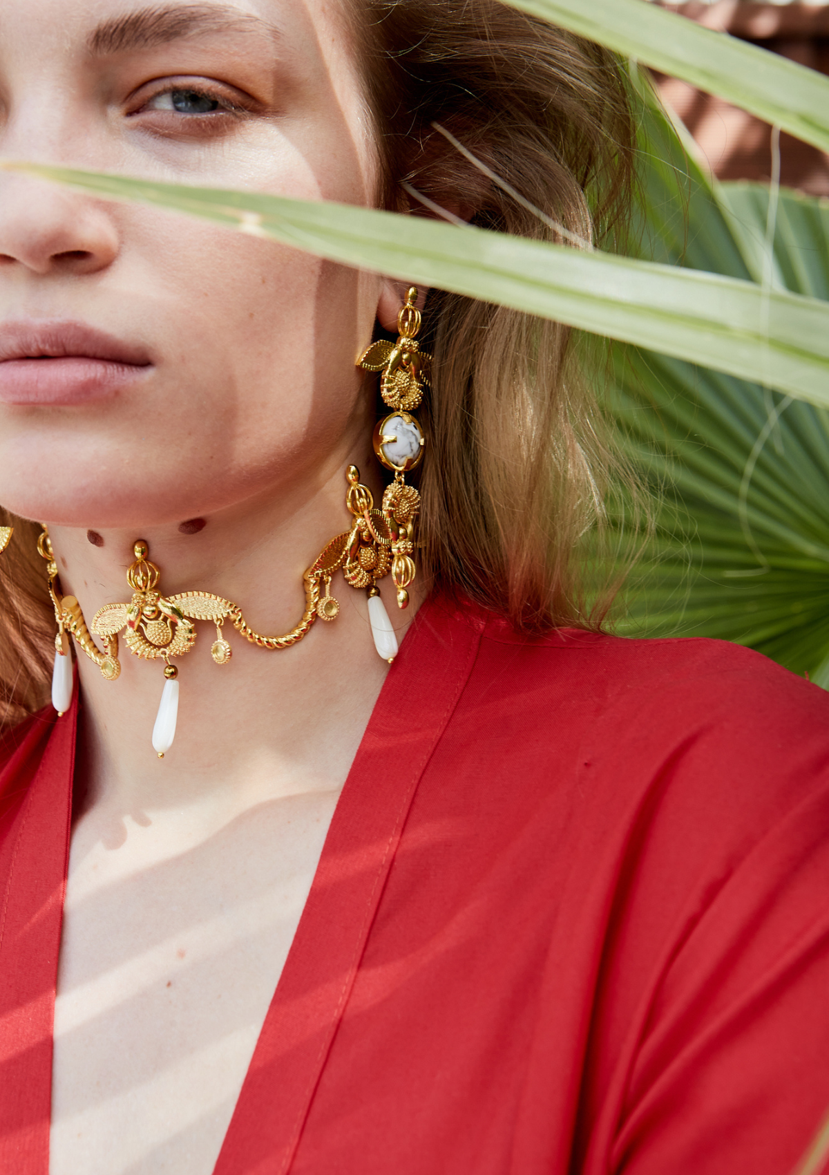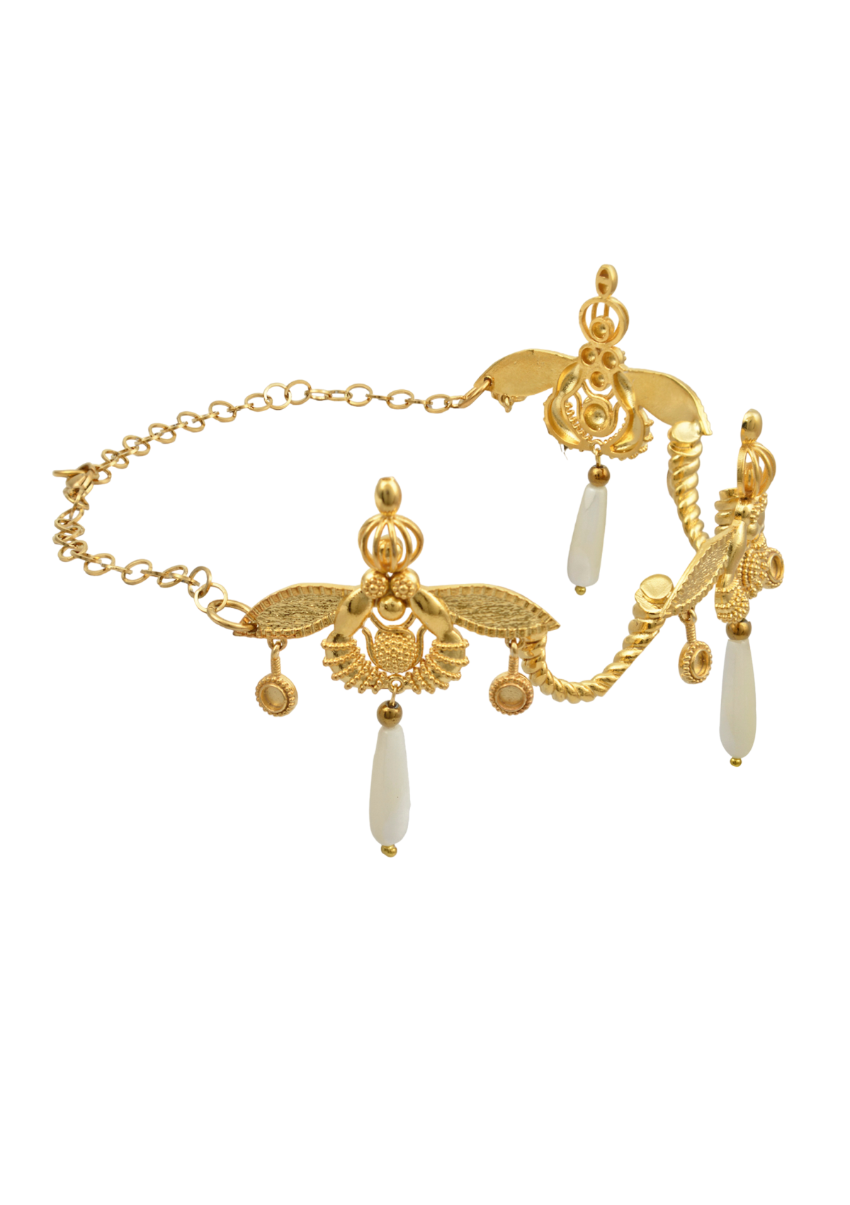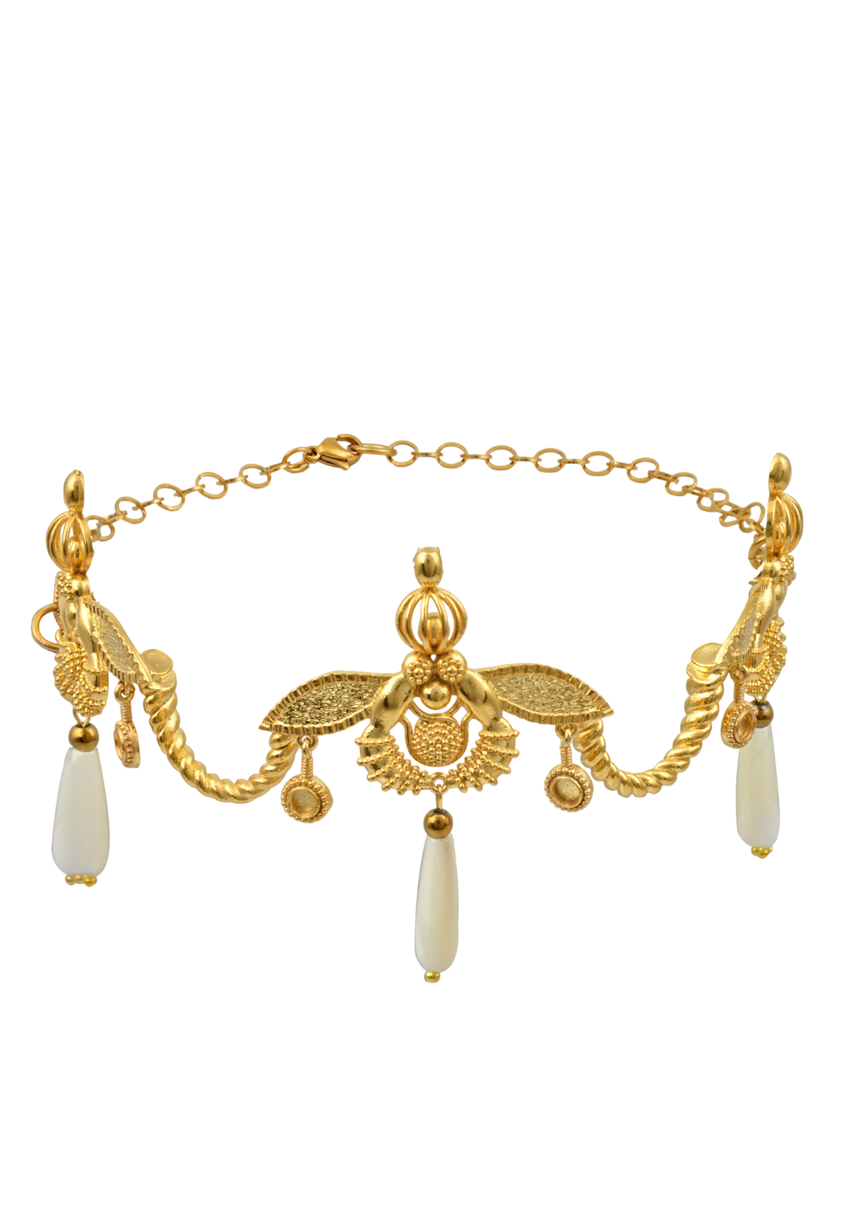 Ogrlica izradjena od solidne bronze u 24k pozlati, polu drago kamenje- Zlatni hematit, Mother of Pearl, nerdjajući čelik.