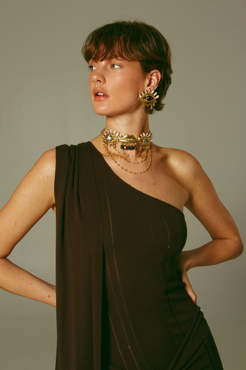 Ogrlica od solidne bronze u 24k pozlati. Polu drago kamenje Hematit i Crni Mother of Pearl. Ručni rad.