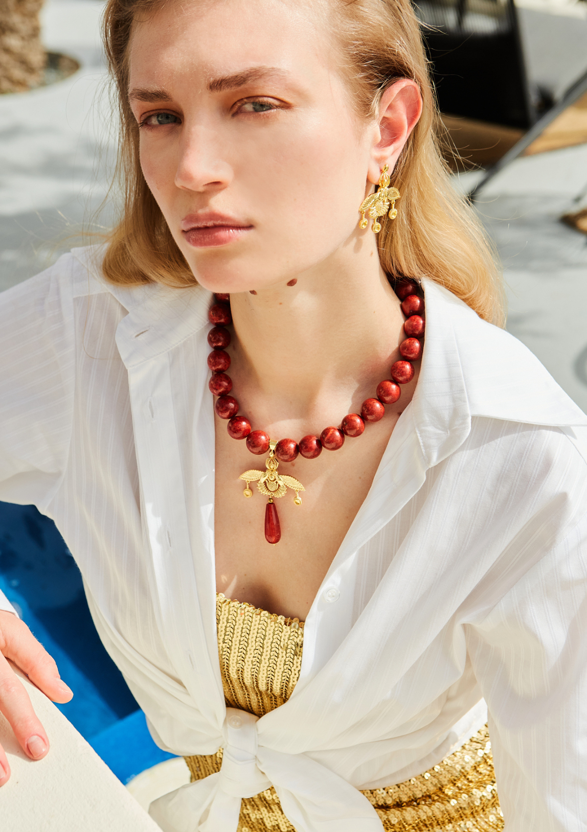 Ogrlica od solidne bronze, u 24k pozlati, sa polu dragim kamenjem od narandžastog Žada.