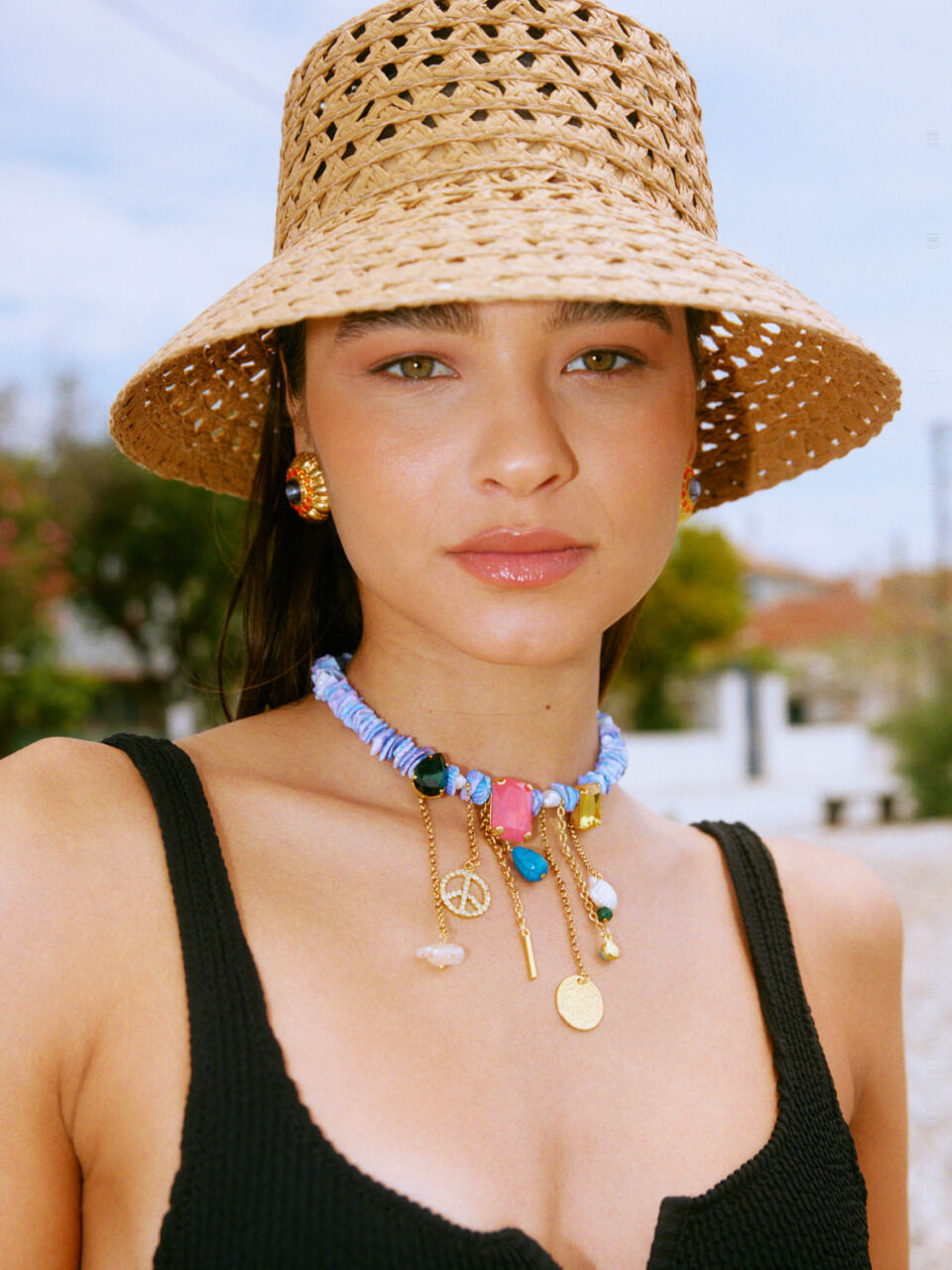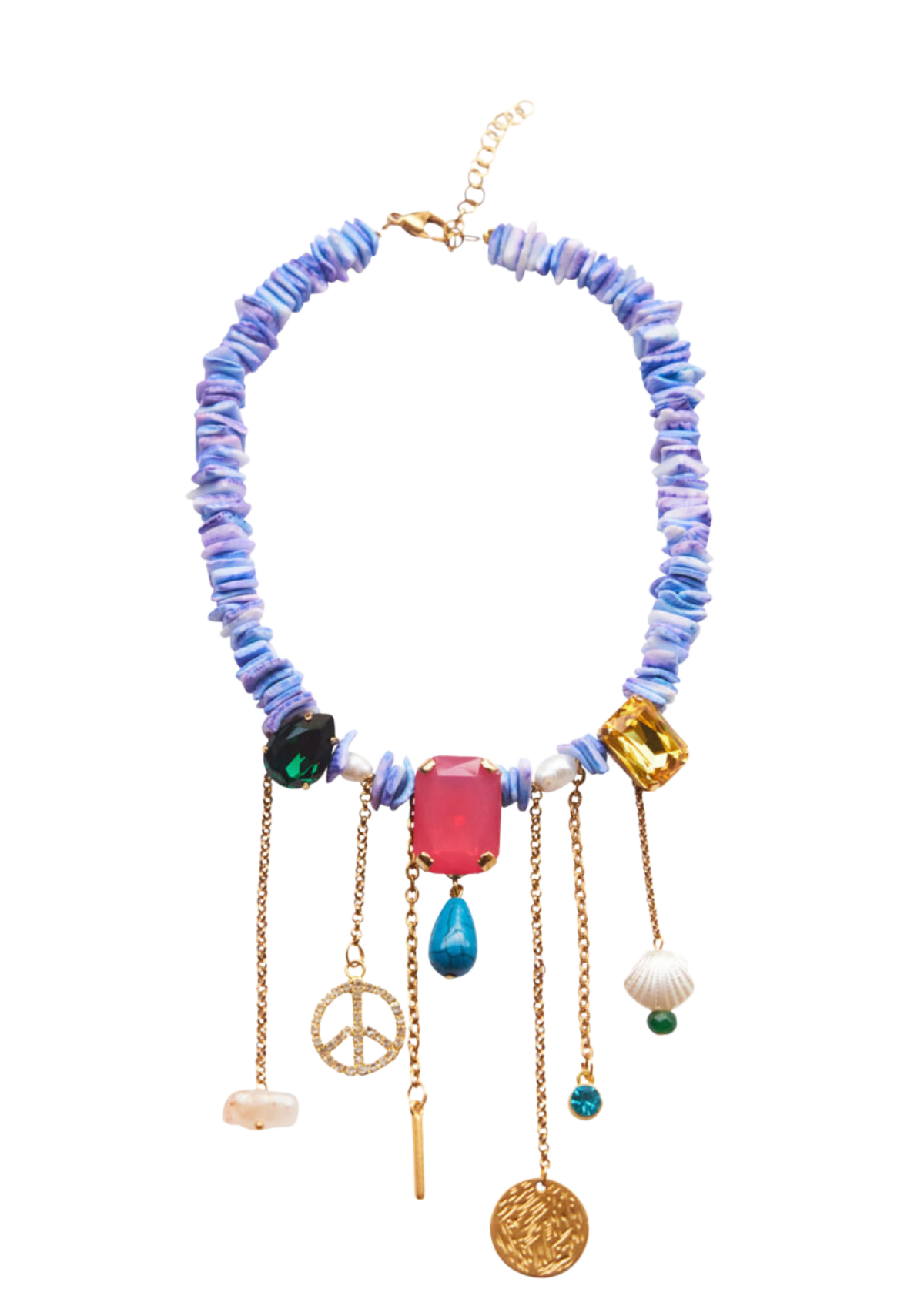 Ogrlica od školjki, mesing obložen srebrom, raznobojni preciosa kristali.