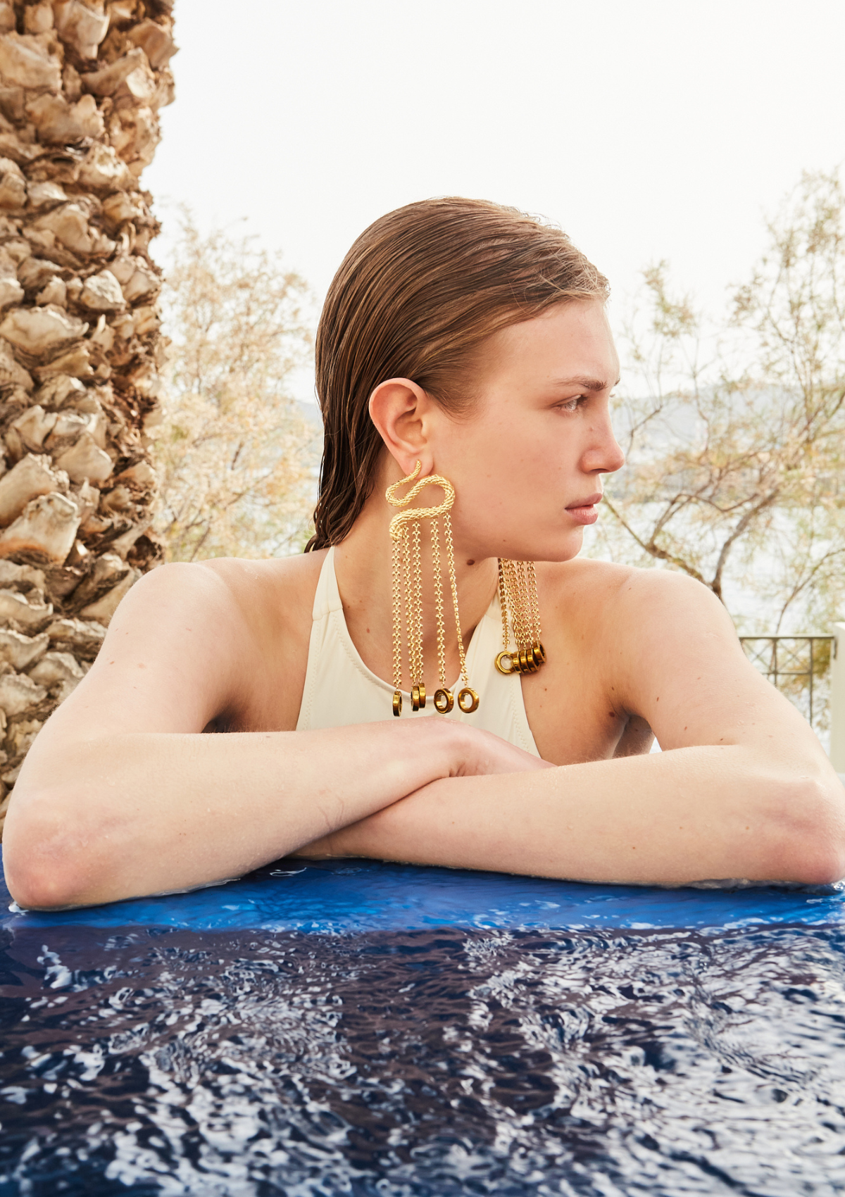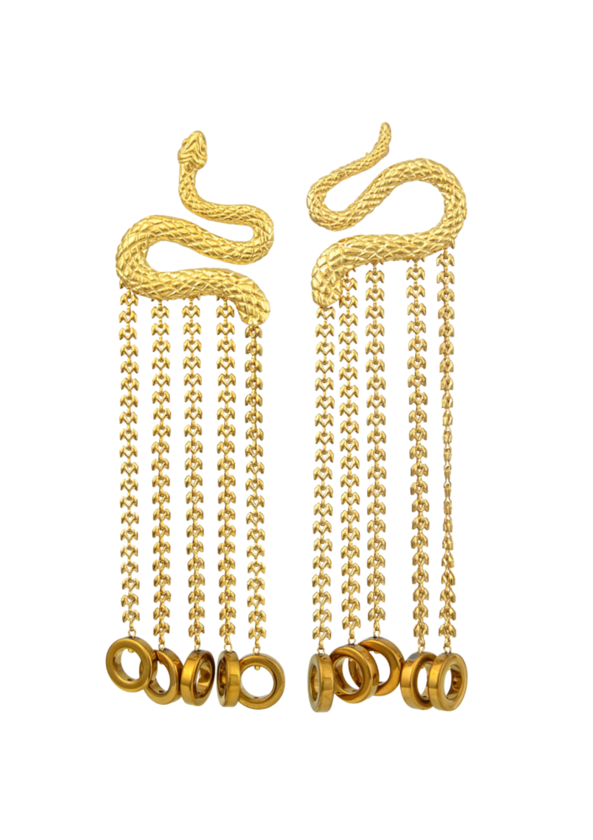 Mindjuše su izradjene od solidne bronze, obložene 24k zlatom. Kružni privesci su od polu dragog kamena-Zlatnog Hematita. Lanci su od nerdjajućeg čelika. Iglica je od srebra 925.